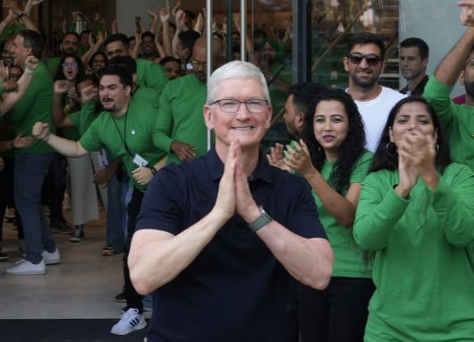 팀 쿡(가운데) 애플 최고경영자(CEO)가 2023년 4월 18일(현지시간) 인도 뭄바이에 애플 플래그십 스토어를 열고 고객들을 맞이하고 있다. 뭄바이(인도)/AP뉴시스 |