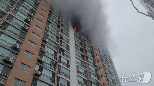 (부산=뉴스1) 장광일 기자 = 24일 오전 7시 13분쯤 부산 해운대구 반여동 25층짜리 아파트 14층에서 원인 모를 불이 났다.