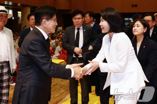 김문수 국민의힘 대통령 후보와 이재명 더불어민주당 대통령 후보 부인인 김혜경 여사가 24일 충북 단양군 구인사에서 열린 상월원각대조사 제51주기 열반대재에서 인사를 나누고 있다. 2025.5.24/뉴스1 ⓒ News1 김민지 기자 |