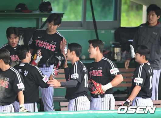 [OSEN=인천, 김성락 기자] 24일 오전 인천 강화군 SSG퓨처스필드에서 2025 KBO 퓨처스리그 SSG 랜더스와 LG 트윈스의 경기가 열렸다. 이날 경기는 SSG 랜더스가 LG 트윈스를 상대로 6-5로 승리했다. 6회초 2사 LG 김주성 역전 투런포를 날린 뒤 더그아웃에서 동료선수들과 기쁨을 나누고 있다. 2025.05.24 / ksl0919@osen.co.kr