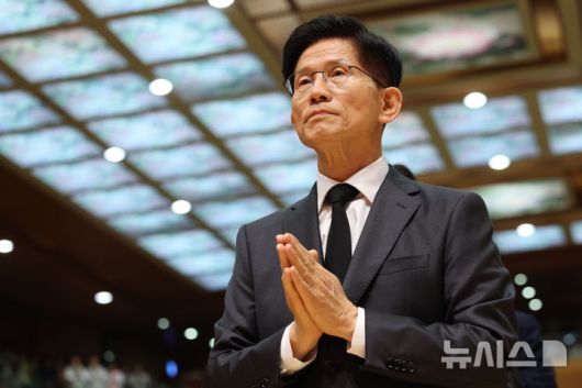 [단양=뉴시스] 권창회 기자 = 김문수 국민의힘 대선 후보가 24일 오전 충북 단양군 구인사에서 열린 상월원각대조사 제51주기 열반대제에 참석해 합장하고 있다. 2025.05.24. kch0523@newsis.com |