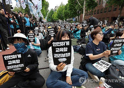 (서울=연합뉴스) 서명곤 기자 = 24일 서울 경복궁 영추문 앞에서 열린 전국교직원노동조합 창립 36주년 전국교사결의대회에서 참가자들이 교육 대개혁 실현, 안전하게 교육할 권리보장 등의 구호를 외치고 있다. 2025.5.24