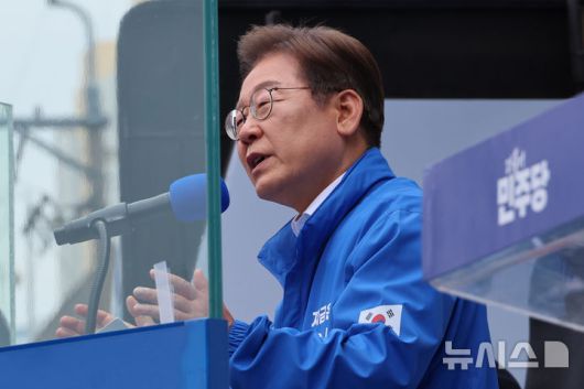 [서울·안양=뉴시스] 오정우 남정현 기자 = 이재명 더불어민주당 대선후보는 24일 윤석열 전 대통령을 가리켜 "내란·외환의 우두머리가 거리를 활보하며 부정선거 영화를 관람하면서 희희낙락하고 있다"고 말했다.