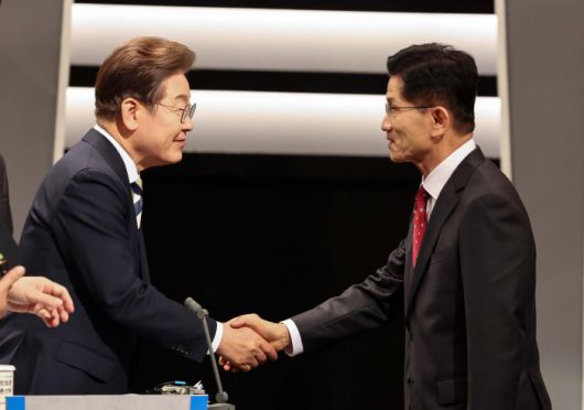 [서울=뉴스핌] 국회사진기자단 = 23일 서울 영등포구 여의도 KBS 스튜디오에서 열린 중앙선거방송토론위원회 주관 제21대 대통령선거 후보자 토론회에 앞서 더불어민주당 이재명 대선후보(왼쪽)와 국민의힘 김문수 대선후보가 인사를 나누고 있다. 2025.05.23 photo@newspim.com |