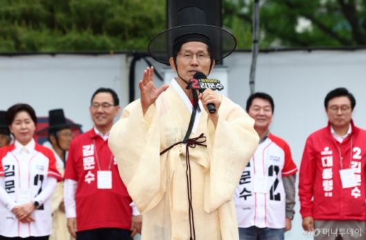 김문수 국민의힘 대선 후보가 24일 경북 안동시 웅부공원 인근에서 열린 유세에서 도포와 갓을 쓰고 지지호소를 하고 있다/사진=뉴시스 |
