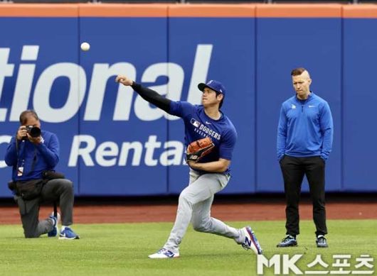 오타니 쇼헤이가 24일(한국시간) 미국 뉴욕주 플러싱의 시티필드에서 열리는 뉴욕 메츠와 원정경기를 앞두고 캐치볼을 소화하고 있다.사진=고홍석 MK스포츠 통신원 |