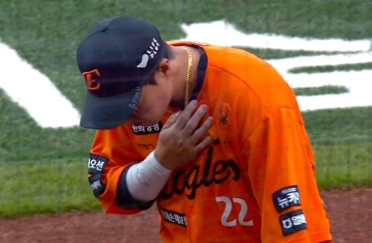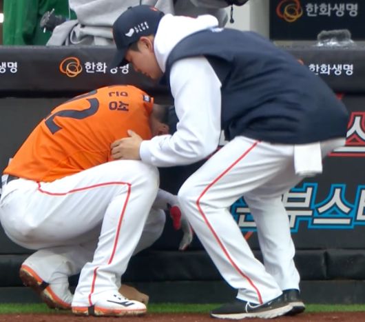 (엑스포츠뉴스 대전, 조은혜 기자) 한화 채은성이 수비 중 타구에 맞고 교체됐다.