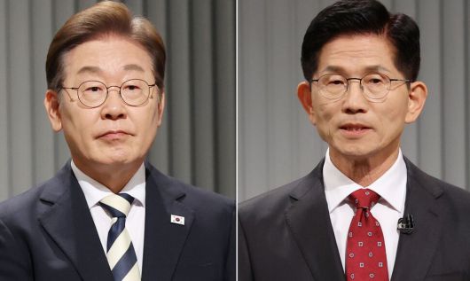 이재명 더불어민주당 대통령 후보(왼쪽)와 김문수 국민의힘 대통령 후보가 23일 저녁 서울 영등포구 한국방송(KBS) 본관 스튜디오에서 열린 중앙선거방송토론위원회 주관 제21대 대통령선거 2차 후보자토론회 시작에 앞서 토론 준비를 하고 있다. 국회사진기자단 |