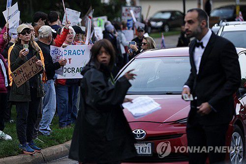(스털링<미 버지니아주> AFP=연합뉴스) 2025년 5월 22일 미국 버지니아주 스털링에 있는 트럼프 내셔널 골프 클럽에서 열린 비공개 만찬 행사에 항의하는 시위가 열리고 있는 와중에, 만찬에 초대된 한 초청객이 도착하고 있다. (Getty Images via AFP) 2025.5.24.