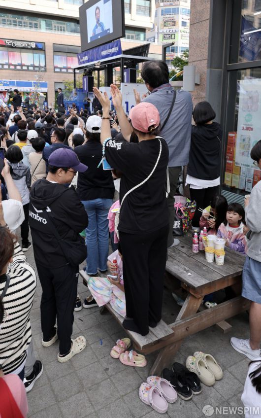 [시흥=뉴스핌] 이호형 기자 = 24일 오후 경기 시흥시 배곧광장에서 열린 이재명 더불어민주당 대선후보 유세현장에서 시민들이 신발을 벗고 의자에 올라 연설을 듣고 있다. 2025.05.24 leemario@newspim.com