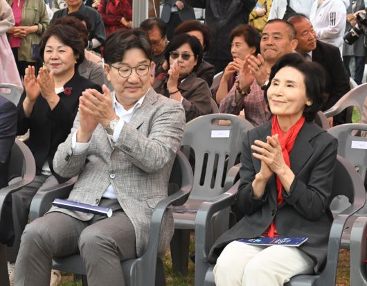 23일 국민의힘 김문수 대선 후보의 배우자 설난영 여사와 권성동 원내대표가 '2025 강릉차문화축제'가 열리고 있는 오죽한옥마을을 방문, 손뼉을 치고 있다.
