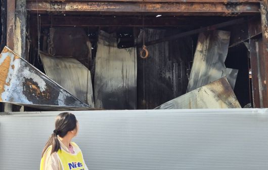 고공농성 500일을 열흘 앞둔 2025년 5월11일, 박정혜씨가 불탄 공장 안을 바라보고 있다. 신다은 기자 |