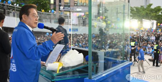 [안산=뉴스핌] 이호형 기자 = 이재명 더불어민주당 대선 후보가 24일 경기 안산시 안산문화광장에서 지지를 호소하고 있다. 2025.05.24 leemario@newspim.com