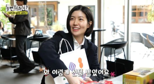 배우 심은경이 동료 배우 이이경의 뜻밖의 생일 선물에 잠시 정색했지만, 이내 웃음을 터뜨리는 반응으로 촬영장을 유쾌하게 물들였다.사진=MBC ‘놀뭐’ 캡처 |
