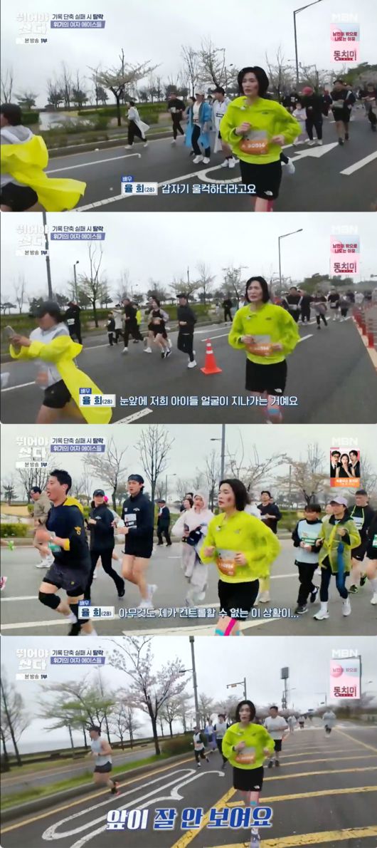 달리면서 눈물을 보이는 율희는 “눈 앞에 저희 아이들 얼굴이 지나가는 거예요. 감정도, 호흡도, 몸도 아무것도 컨트롤할 수 없는 상황이 (힘들었다)”라고 인터뷰를 통해 전했다. 션은 페이스를 올리려고했고, 율희는 “못할 것 같다”라고 말했다.