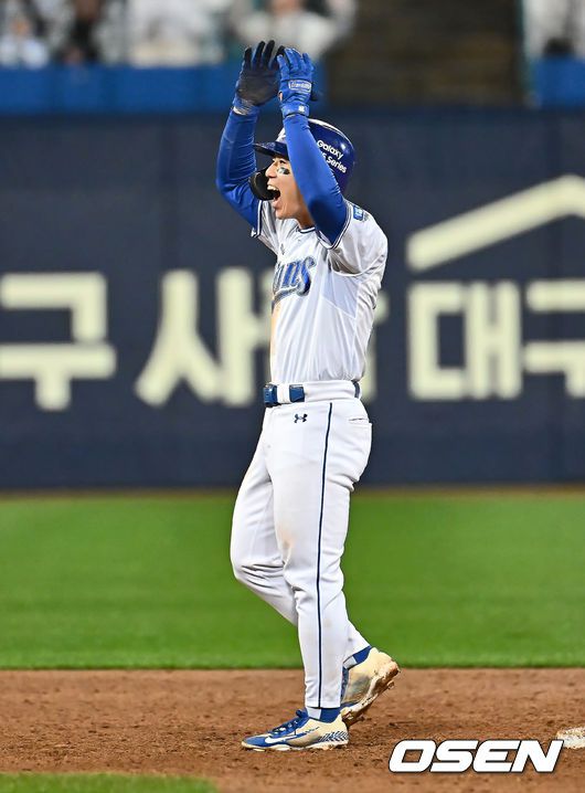 [OSEN=대구, 이석우 기자] 24일 대구삼성라이온즈파크에서 2025 신한 SOL 뱅크 KBO 리그 삼성 라이온즈와 KIA 타이거즈의 경기가 열렸다. 홈팀 삼성은 이승현이, 방문팀 KIA는 김도현이 선발 출전했다. 삼성 라이온즈 김성윤이 8회말 2사 만루 좌익수 뒤 2타점 2루타를 치고 세리머니를 하고 있다. 2025.05.24 / foto0307@osen.co.kr