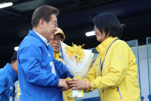 이재명 더불어민주당 대선 후보가 24일 경기 안산시 단원구 안산문화광장에서 열린 유세에서 세월호 참사 유가족인 정부자씨로부터 프리지어 꽃을 받고 있다. 연합뉴스 |