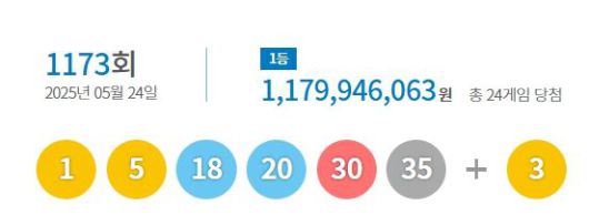 [서울=뉴시스] 24일 실시된 제1173회 동행복권 로또 추첨 결과 1등 당첨 번호는 '1, 5, 18, 20, 30, 35'이며 보너스 번호는 '3'으로 결정됐다. (사진=동행복권 홈페이지 캡처) 2025.05.24. photo@newsis.com *재판매 및 DB 금지 *재판매 및 DB 금지