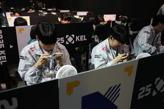 DRX 선수단이 24일 부산 진구 부산e스포츠경기장에서 열린 2025 KEL 배틀그라운드 모바일 본선 1일차 경기에 임하고 있다. 사진 | 한국e스포츠협회 |