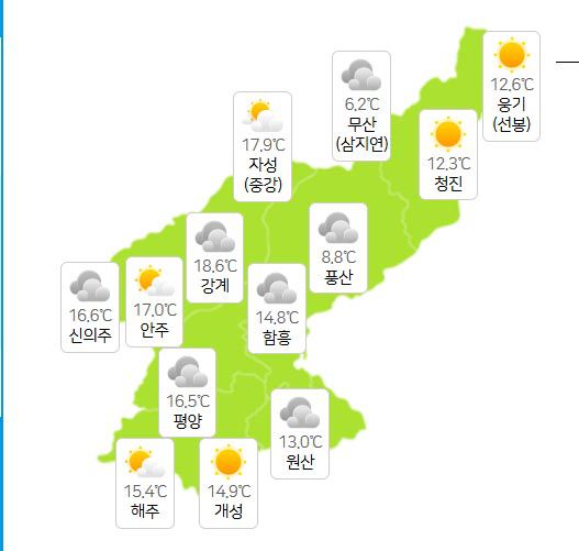 북한 오늘날씨 25일은 전 지역 대체로 맑으나 평안도와 함경도 가끔 구름많고, 아침까지 평안도, 늦은 오후까지 함경도 곳에 따라 비가 내리겠따.