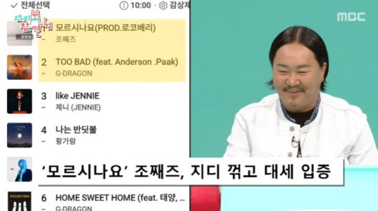 송은이는 "대단하다. 음원 차트 1위도 쉽지 않은데 다른 홍보 없이 오로지 목소리만으로 1위 했다는 게 대단하다"면서 "그때 발매 됐던 곡 중 지디 노래도 있었다"고 말해 눈길을 끌었다.