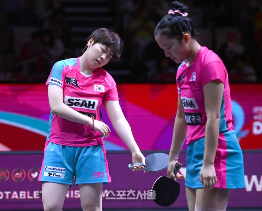 신유빈, 유한나가 24일 카타르 도하 루사일 아레나에서 열린 2025 국제탁구연맹(ITTF) 세계선수권대회 여자복식 4강 소피아 폴차노바(오스트리아) - 베르나데트 소츠(루마니와)과 경기에서 패한 후 아쉬워하고 있다. 2025. 5. 24. 도하(카타르) | 최승섭기자 thunder@sportsseoul.com