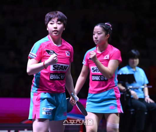 신유빈, 유한나가 24일 카타르 도하 루사일 아레나에서 열린 2025 국제탁구연맹(ITTF) 세계선수권대회 여자복식 4강 소피아 폴차노바(오스트리아) - 베르나데트 소츠(루마니와)과 경기에서 득점 후 환호하고 있다. 2025. 5. 24. 도하(카타르) | 최승섭기자 thunder@sportsseoul.com
