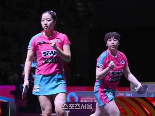 신유빈, 유한나가 24일 카타르 도하 루사일 아레나에서 열린 2025 국제탁구연맹(ITTF) 세계선수권대회 여자복식 4강 소피아 폴차노바(오스트리아) - 베르나데트 소츠(루마니와)과 경기에서 득점 후 환호하고 있다. 2025. 5. 24. 도하(카타르) | 최승섭기자 thunder@sportsseoul.com