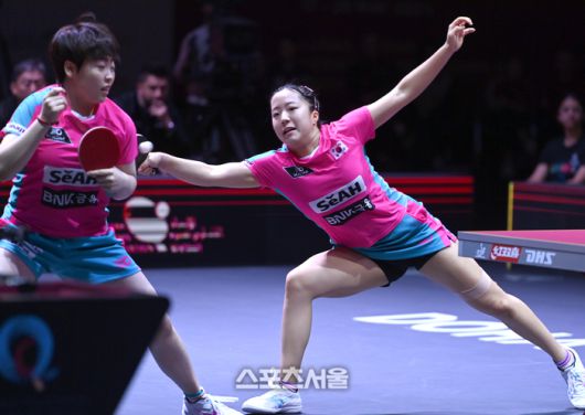 신유빈, 유한나가 24일 카타르 도하 루사일 아레나에서 열린 2025 국제탁구연맹(ITTF) 세계선수권대회 여자복식 4강 소피아 폴차노바(오스트리아) - 베르나데트 소츠(루마니와)과 경기를 펼치고 있다. 2025. 5. 24. 도하(카타르) | 최승섭기자 thunder@sportsseoul.com