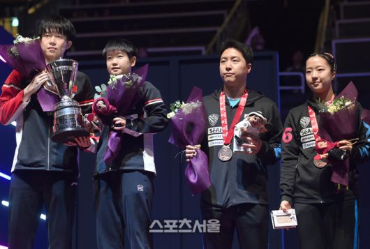 임종훈, 신유빈이 24일 카타르 도하 루사일 아레나에서 열린 2025 국제탁구연맹(ITTF) 세계선수권대회 혼합복식 시상식에서 동메달을 걸고 포즈를 취하고 있다. 왼쪽은 우승을 한 중국 쑨잉사 - 왕추친. 2025. 5. 24. 도하(카타르) | 최승섭기자 thunder@sportsseoul.com