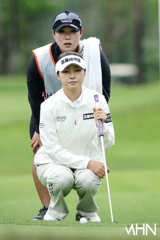 [mhn포토] 한아름, 캐디 장윤석과 살피는 퍼트 라인