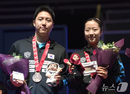 (도하(카타르)=뉴스1) 안영준 기자 = 한국 탁구 혼합복식의 임종훈(한국거래소)-신유빈(대한항공) 조가 동메달 시상식을 마친 뒤 "다음에는 애국가를 틀어보겠다"고 당찬 포부를 전했다.