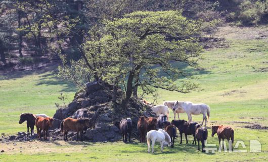 [제주=뉴시스] 우장호 기자 = 맑은 날씨를 보인 17일 오전 제주시 용강동 마(馬) 방목지에서 제주축산생명연구원 관계자들이 천연기념물 제347호 제주마에 먹이를 주고 있다. 2025.04.17. woo1223@newsis.com |