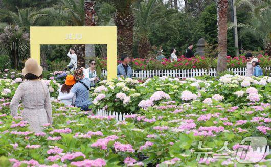 14일 오전 수국이 활짝 핀 제주 서귀포시 남원읍 휴애리자연생활공원에서 관광객들이 즐거운 시간을 보내고 있다. 2025.5.14/뉴스1 ⓒ News1 오현지 기자 |