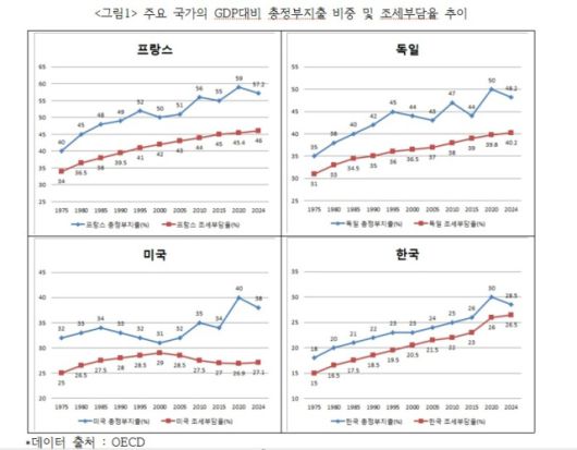 아래의 <그림1>은 OECD 주요 국가와 한국의 GDP대비 총정부지출 비중 및 조세부담율 추이를 나타낸다. 주요 국가들과 한국은 1975년 이래로 현재까지 지속적인 조세부담율 증가와 함께 총정부지출 증가 추이를 보여준다. 작은 정부론이 지배했던 신자유주의 시대에도 예외는 없었다. 이러한 역사적 추이는 조세부담율을 높이고 재정지출을 늘려 사회문제 해결에 앞장서는 것이 정부 본연의 역할임을 보여준다. 당연하게도 이렇게 증가해온 조세부담율이 각 나라 국민들의 자산과 소득 격차에 상식적이고 합리적으로 조응해왔는지 구체적으로 검토하고 논의해야 한다. 그런 점에서 윤석열 정부의 부자감세 정책은 더더욱 시대착오적이다.