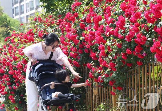 계절의 여왕 5월은 도심 곳곳에 곱게 핀 장미가 자태를 뽐내는 달. 초여름 날씨를 보인 12일 대구 중구 남산동 주택가에서 산책 나온 아기와 엄마가 한 아파트 울타리에 활짝 핀 장미꽃을 감상하고 있다./뉴스1 ⓒ News1 공정식 기자 |