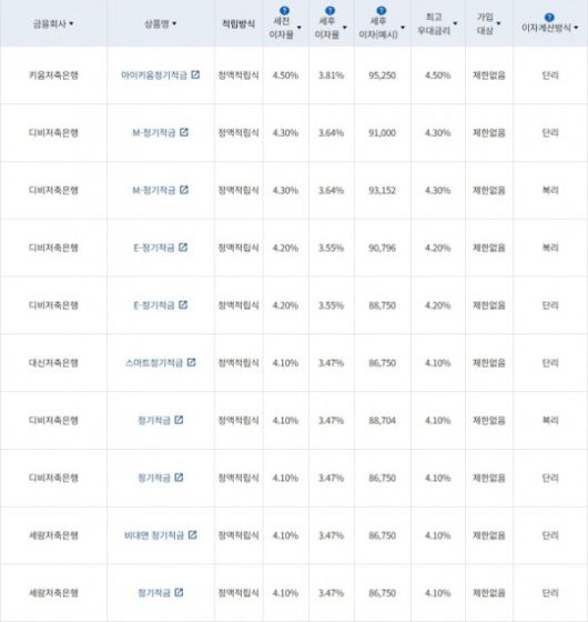 이어 DB저축은행의 'M-정기적금'이 4.30%의 세전이자율을 제공하며 뒤를 이었다.