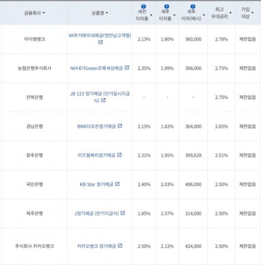 25일 금융감독원 금융상품통합비교공시에 따르면 은행 24개월 정기예금 상품 중 최고 우대금리를 제공하는 상품은 iM뱅크의 ‘iM주거래우대예금(첫만남고객형)’으로, 최고 2.78%의 금리를 제공한다. 우대 조건은 ▲‘목돈굴리기예금’ 최초 가입 시 0.20%p ▲상품 가입 전 최근 1개월 이내 신용(체크)카드 신규 발급 시 0.20%p ▲상품 가입 전 최근 1개월 이내 인터넷·폰·모바일뱅킹으로 가입 시 0.20%p 등이다. 계좌당 가입 최저 한도는 100만원이다.