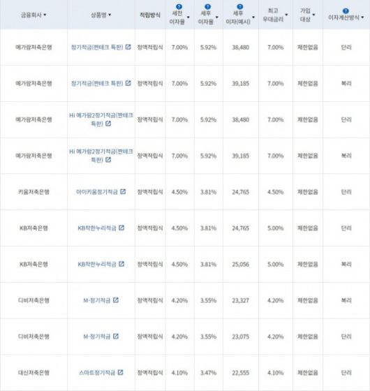 25일 금융감독원 금융상품통합비교공시에 따르면 저축은행 12개월 정기적금 가운데 세전 이자율 기준 기본 금리가 가장 높은 상품은 예가람저축은행의 '정기적금(짠테크 특판)'과 'Hi 예가람e정기적금(짠테크 특판)'으로 연 7.00%를 제공한다.