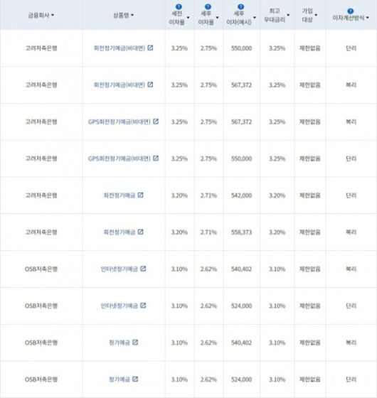 25일 금융감독원 금융상품통합비교공시에 따르면 저축은행 24개월 정기예금 가운데 세전 이자율 기준 기본 금리가 가장 높은 상품은 고려저축은행의 '회전정기예금(비대면)'과 'GPS회전정기예금(비대면)'으로 연 3.25%의 금리를 제공한다.