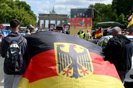 지난 24일 베를린에서 극우 단체 등을 포함한 '도이칠란트 슈테트 아우프'(독일이 일어선다)라는 네트워크가 주최한 시위에 참석한 두 남성이 독일 국기를 들고 행진을 하고 있다. AFP 연합뉴스 |