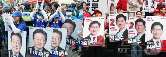 이재명 더불어민주당 대통령 후보(왼쪽)와 김문수 국민의힘 대통령 후보 선거운동원들이 20일 각각 경기 의정부시 로데오거리와 서울 강서구 남부골목시장 인근에서 선거운동을 펼치고 있다. 2025.5.20/뉴스1 ⓒ News1 안은나 기자,김민지 기자 |