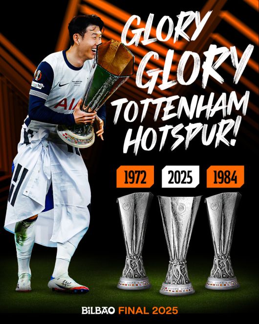 토트넘은 23일 스페인 빌바오에서 열린 2024-25 유럽축구연맹(UEFA) 유로파리그 결승전에서 토트넘은 맨체스터 유나이티드를 1-0으로 꺾고 우승을 차지했다. 손흥민은 발 부상에도 불구하고 후반 교체 투입되어 팀의 공격을 이끌었고, 경기 종료 후 정중앙에서 트로피를 들어 올리는 장면의 주인공이 됐다.