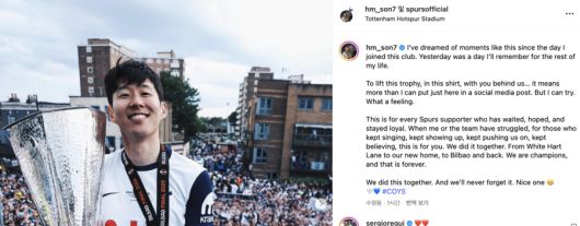 손흥민은 25일(이하 한국시간) 자신의 사회관계망서비스(SNS)를 통해 “토트넘에 처음 입단한 날부터 이런 순간을 꿈꿨다. 어제는 제 인생에서 영원히 기억될 날이었다. 이 유니폼을 입고, 여러분의 응원을 받으면서 이 트로피를 들어올릴 수 있다는 건, 단순한 인스타그램 포스트로는 절대 다 표현할 수 없는 감정이었다. 정말 벅찬 감정이었다”라면서 전 세계 축구 팬들에게 감사 인사를 전했다.