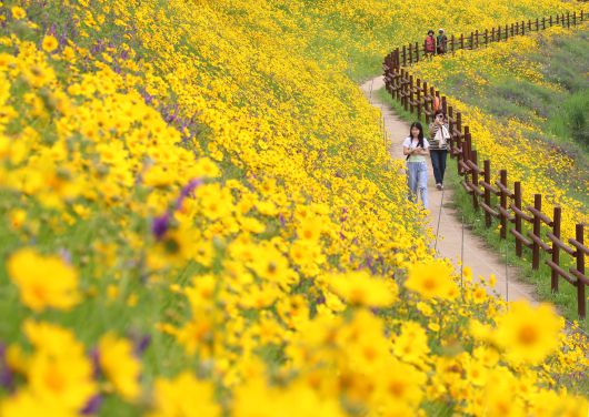 초여름 더위가 한풀 꺾이고 선선한 날씨를 보인 23일 경남 함안군 악양생태공원을 찾은 관광객들이 활짝 핀 금계국을 감상하고 있다. /뉴스1 |