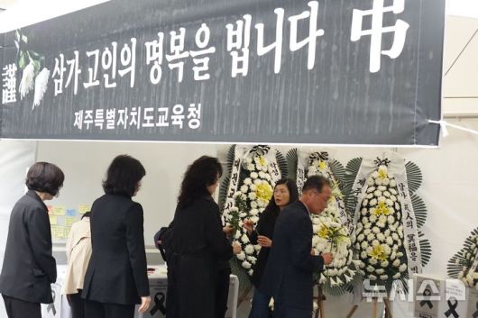 [제주=뉴시스] 양영전 기자 = 지난 23일 오후 제주시 연동 제주도교육청 앞마당에 제주 한 중학교에서 숨진 교사의 분향소가 마련된 가운데 조문객들의 발걸음이 이어지고 있다. 2025.05.23. 0jeoni@newsis.com |