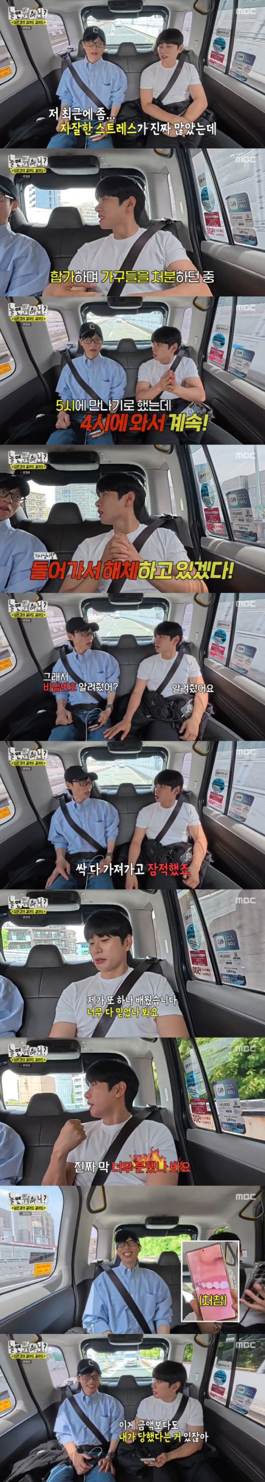 그때 이이경은 "최근에 좀 자잘한 스트레스가 진짜 많았다"면서 "중고 사기 당했다"고 털어놨다. 최근 부모님과 합가 결정 후 사용 중이던 가구들을 처분 중이었다는 이이경. 그는 "중고 시장에 내놨는데 누가 바로 사간다고 하더라"며 "근데 자꾸 정해진 시간이 있는데 한 시간 먼저 와서 '해체하는 기사랑 같이 왔다. 들어가서 해체하고 있겠다'고 하더라"고 말했다.