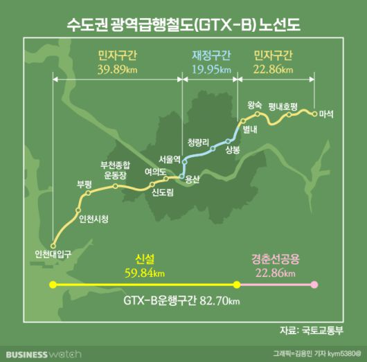 GTX-B는 인천 송도(인천대 입구)에서 신도림, 여의도, 서울역, 용산, 청량리 등을 거쳐 남양주 마석을 잇는 노선이에요. 약 82㎞ 구간으로 민간이 맡는 인천대 입구~용산, 상봉~마석 구간은 4조2894억원이 투입될 예정이에요. 용산~상봉은 재정이 투입되는 구간으로 2조7774억의 공사비가 들 예정이에요.