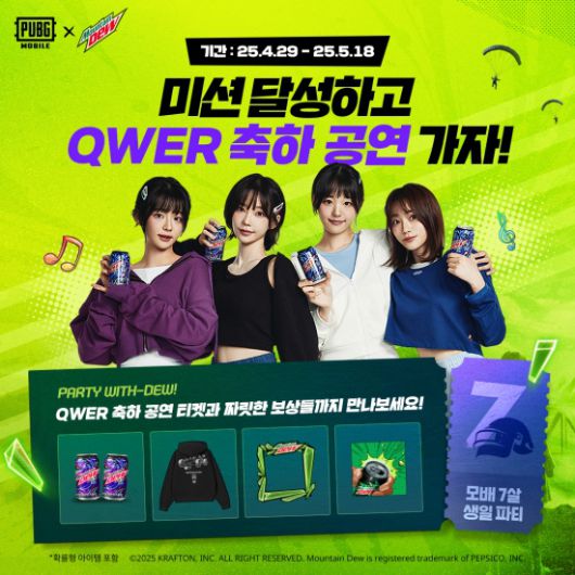 한편, '마운틴듀' 컬래버레이션 아이템 이벤트는 5월 8일부터 6월 30일까지 진행한다. 미션을 달성하면 QWER과 함께한 공식 캠페인 음원 'PLAY, WE, DEW'를 '배틀그라운드 모바일' BGM으로 획득할 수 있으며, '마운틴듀' 콘셉트의 의상·낙하산·참 아이템·이벤트 상· 치킨 메달 등의 보상을 얻을 수 있다.