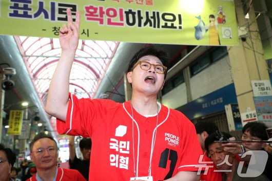 한동훈 국민의힘 전 대표가 22일 오전 충북 청주시 육거리종합시장에서 김문수 대통령 후보 지원 유세를 하고 있다. 2025.5.22/뉴스1 ⓒ News1 김용빈 기자 |